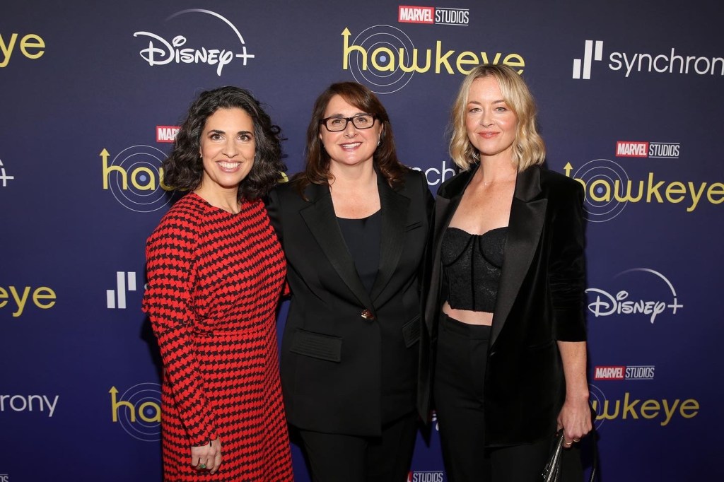 LOS ANGELES, CALIFORNIA – NOVEMBER 17: (L-R) Jac Schaeffer, Executive VP of Production at Marvel Studios Victoria Alonso Alonso, and Heather Quinn attend the Hawkeye Los Angeles Launch Event at El Capitan Theatre in Hollywood, California on November 17, 2021. (Photo by Jesse Grant/Getty Images for Disney)