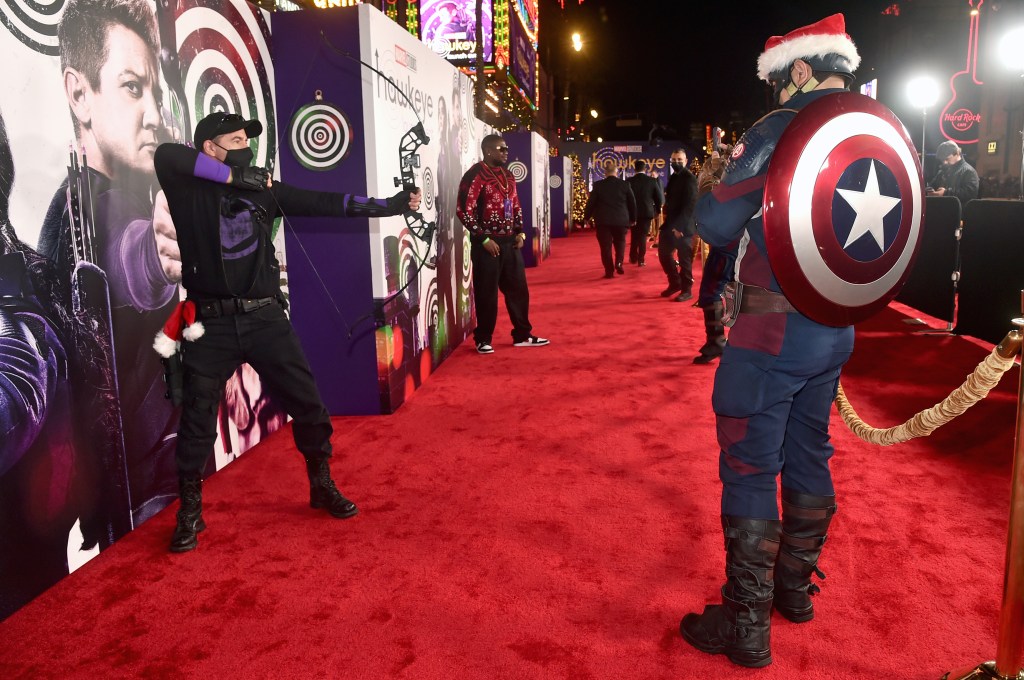 LOS ANGELES, CALIFORNIA – NOVEMBER 17: Cosplayers attend the Hawkeye Los Angeles Launch Event at El Capitan Theatre in Hollywood, California on November 17, 2021. (Photo by Alberto E. Rodriguez/Getty Images for Disney)