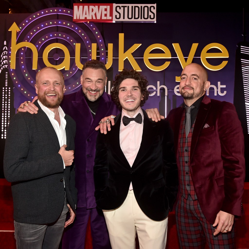 LOS ANGELES, CALIFORNIA – NOVEMBER 17: (L-R) Piotr Adamczyk, Aleks Paunovic, Fra Fee, and Carlos Navarro attend the Hawkeye Los Angeles Launch Event at El Capitan Theatre in Hollywood, California on November 17, 2021. (Photo by Alberto E. Rodriguez/Getty Images for Disney)