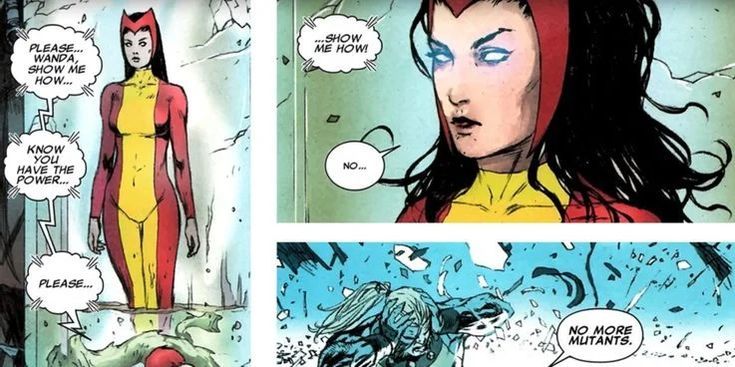 Tras múltiples sucesos, Wanda termina peleada con Magneto y sufriendo nuevamente, por lo que, a modo de venganza, dice las palabras que seguramente muchos conocerán: