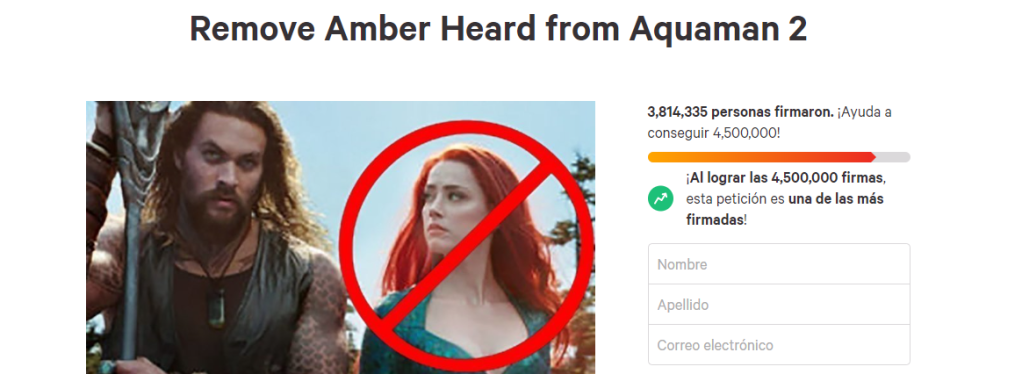 Producto de esto, desde hace varias semanas ya muchos se han unido a través de redes sociales para firmar una petición donde se le exige a Warner removerla por completo de la secuela de Aquaman.