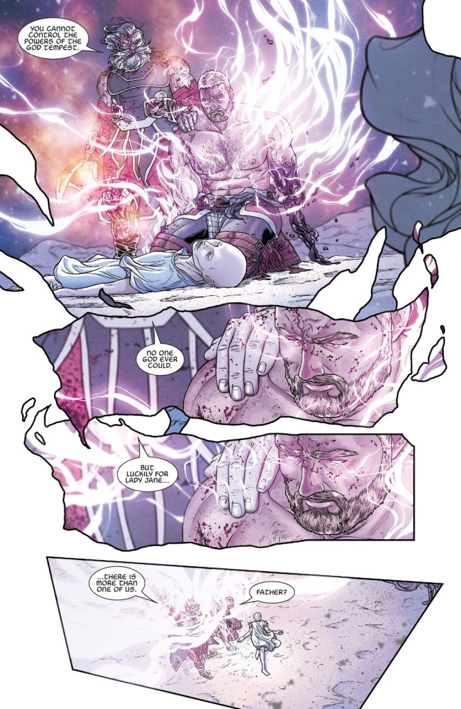 Debido a esto último, este intentó canalizar la Tempestad Divina que estaba contenida en el Mjolnir (el cual por cierto quedó destruido tras el enfrentamiento) e intentó utilizar su poder para devolver la vida a Jane.