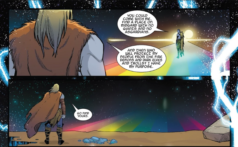 Luego de este momento, Loki insiste a su hermano para que vaya con él y juntos hagan una nueva vida en Midgard, pero Thor se niega, afirmando que ahora que Laufey no está, alguien tiene que defender a su pueblo de los peligros.