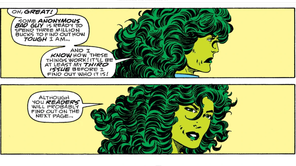 Esto último lo digo debido a que, como una de las curiosidades que tal vez no conocías sobre She-Hulk, ella de hecho fue el primer personaje de Marvel en romper la 4ta pared en los cómics, pues constantemente solía hablar con los lectores e incluso con los redactores y dibujantes.