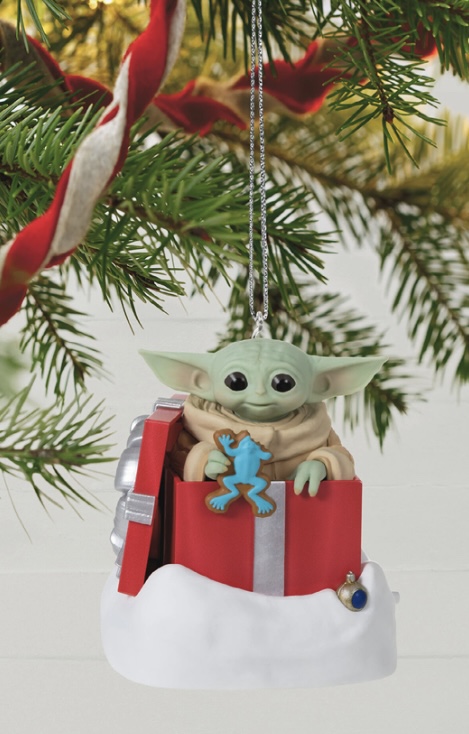 Star Wars: The Mandalorian Grogu Greetings Ornament With Sound and Motion: Dicen que las cosas buenas vienen en frasco pequeño. ¿Y qué podría ser mejor que un regalo de Grogu? Este ornamento navideño viene con el misterioso niño conocido por su capacidad por percibir la Fuerza y que aparece en la serie original Star Wars: The Mandalorian, de Disney+, el cual está sentado sobre una caia envuelta en papel de regalo navideño. En Venta Aquí.