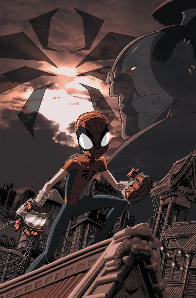En cuanto a Spider-Man, les cuento que en esta realidad Peter Parker era miembro bastante destacado del clan ninja llamado Clan de la Araña, que entrenó gran parte de su vida para vengarse de Venom, un subordinado de Kingpin y Kuji Kuri que había asesinado a su tío Ben.