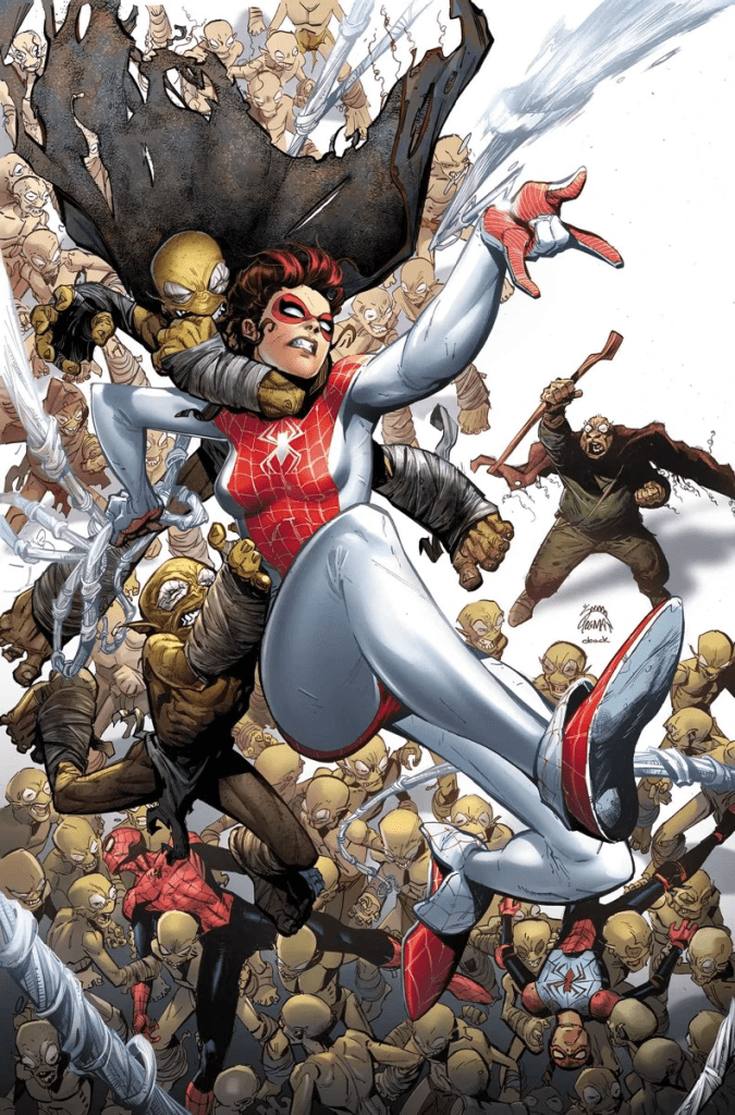 Una del as versiones más llamativas que vimos a lo largo del trailer de Spider-Man Across The Spider-Verse fue sin duda alguna la de Spinneret, o como muchos la conocieron, la Spider-Woman Mary Jane y su pequeña hija, Anna May Parker, por lo que les contaré rápidamente sobre ellas.