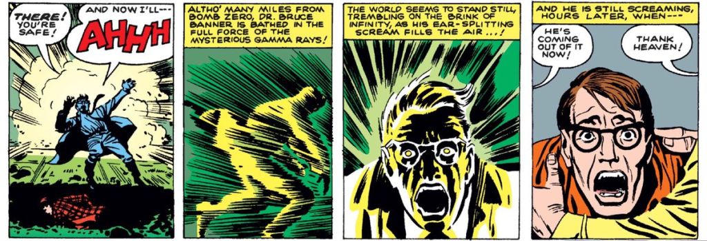 Esto provocó que nuestro protagonista fuera irradiado con partículas radiactivas altamente cargadas, mismas que provocó en él una alteración completa de su cuerpo, haciendo que se transformara con frecuencia en el monstruo humanoide de piel gris (sí, inicialmente era de este color) y enorme poder al que el general Ross bautizó como Hulk.
