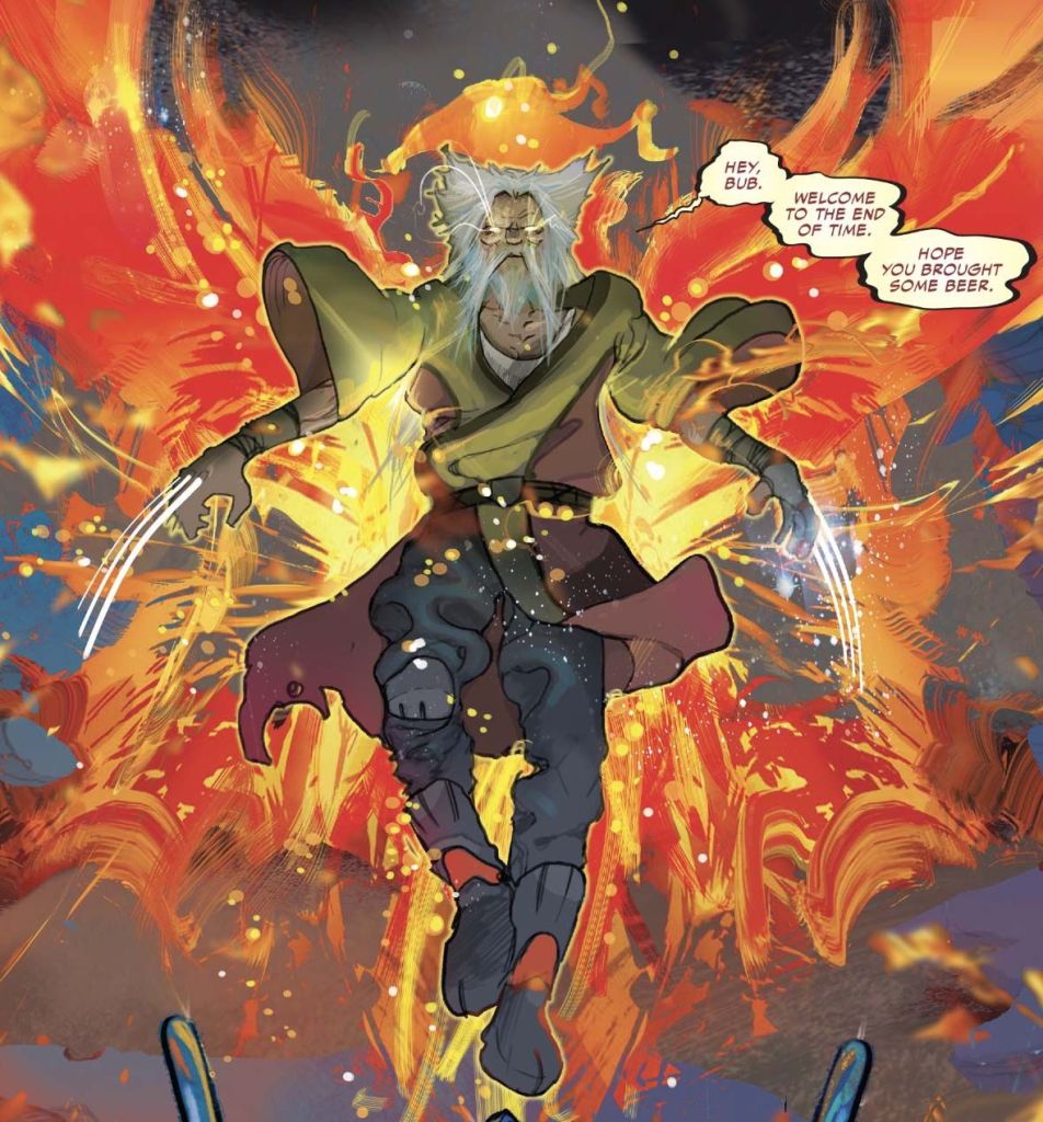 Hablando un poco más a detalle de esta, les cuento que Old Man Phoenix apareció por primera vez en Marvel Legacy #1 (2017), escrito por Jason Aaron y dibujado por Esad Ribić donde podemos ver a un Wolverine anciano viajando por el universo con el poder del Fénix destruyendo cuerpos celestes para ayudar al universo a morir.