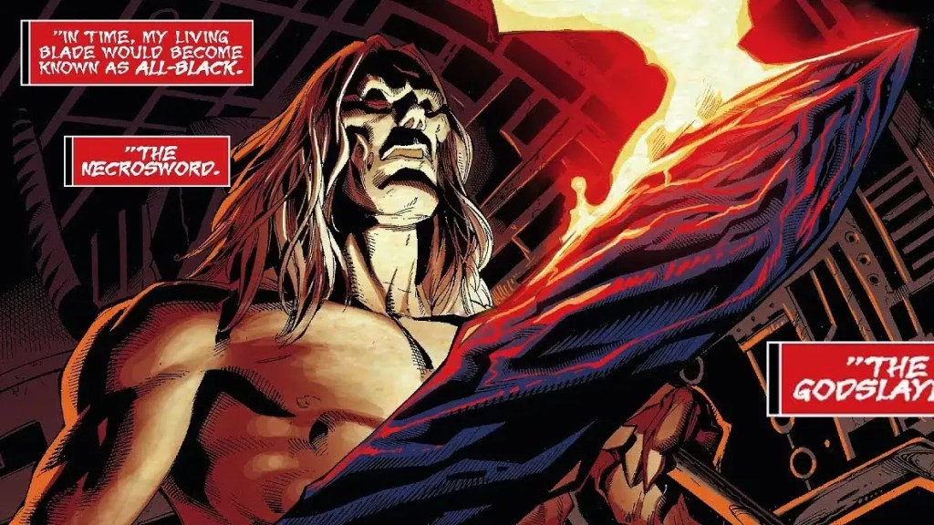 La espada de Knull, conocida como la Necrosword o All-Black, es una de las armas más poderosas del universo Marvel, pues de acuerdo con los cómics, fue forjada a partir de la oscuridad primordial y de la propia esencia del propio personaje.