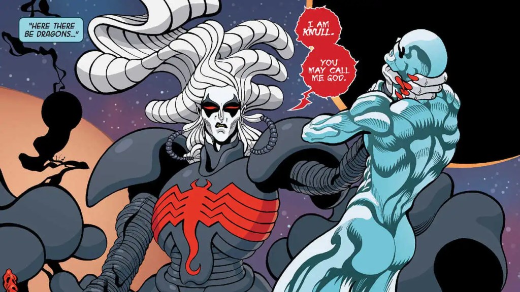 Dicho esto, es importante mencionar que en este número, se introduce a Knull como un dios primordial que forjó la Necrosword, una espada capaz de destruir dioses, y comenzó su cruzada para sumergir al universo en la oscuridad.